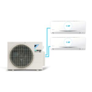 Máy lạnh multi Daikin 1 nóng 2 lạnh sử dụng một dàn nóng kết nối nhiều dàn lạnh, phù hợp cho không gian nhỏ như chung cư. Hệ thống giúp tiết kiệm diện tích ban công, giảm độ ồn, hạn chế dây điện rối rắm và tránh hiện tượng quẩn gió do nhiệt thải tích tụ.