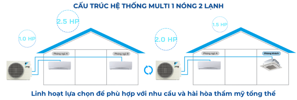 Với thiết kế này, chỉ cần một dàn nóng đặt bên ngoài nhưng có thể kết nối cùng lúc nhiều dàn lạnh bên trong như phòng ngủ, phòng khách. Công suất dàn lạnh linh hoạt (1.0 HP, 1.5 HP, 2.0 HP, 2.5 HP) tùy theo nhu cầu từng phòng, đảm bảo khả năng làm mát hiệu quả mà vẫn giữ được tính thẩm mỹ tổng thể cho ngôi nhà.