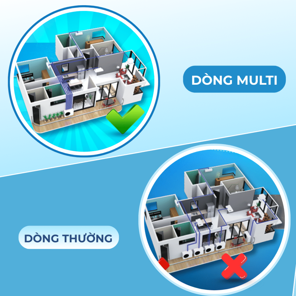 Điều hòa multi sử dụng một dàn nóng kết nối nhiều dàn lạnh trong nhà, giúp tiết kiệm diện tích lắp đặt, giữ được tính thẩm mỹ cho công trình và vận hành êm ái, tiết kiệm điện. Ngược lại, điều hòa thường (máy lạnh cục bộ) thì mỗi dàn lạnh đi kèm một dàn nóng riêng, chi phí đầu tư ban đầu thấp hơn nhưng chiếm nhiều không gian, ảnh hưởng đến mặt tiền và khó đồng bộ khi lắp cho biệt thự hoặc căn hộ cao cấp.