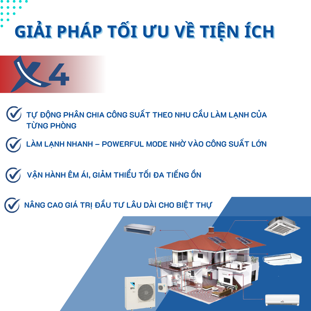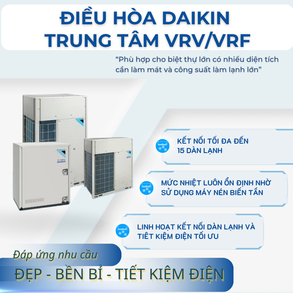 • Phù hợp cho công trình biệt thự vừa và nhỏ, nhà phố, căn hộ cao cấp với nhu cầu 3–5 phòng, tổng diện tích làm mát khoảng 120–250 m².