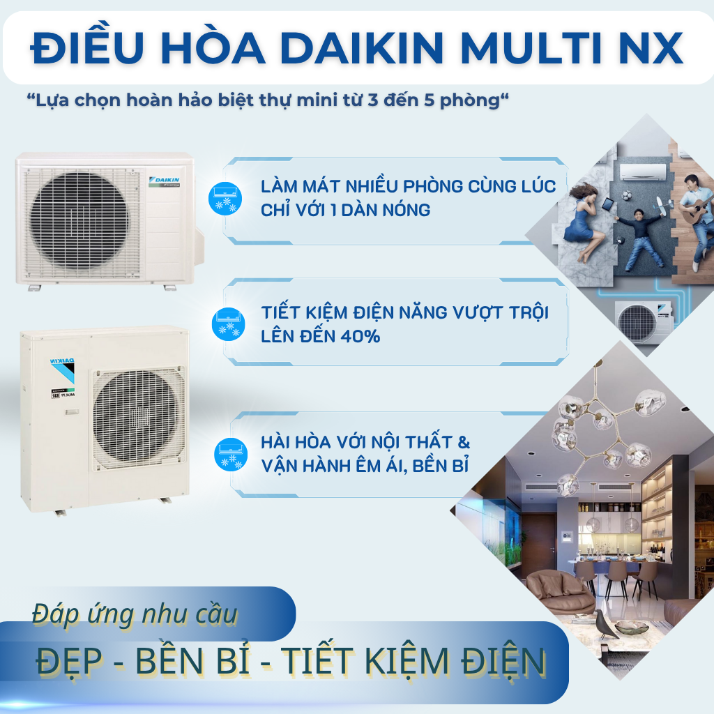Điều hòa Multi mang lại giải pháp toàn diện cho không gian sống hiện đại với ba giá trị nổi bật: tối ưu về tiện ích khi chỉ cần một dàn nóng nhưng có thể kết nối nhiều dàn lạnh, đáp ứng linh hoạt nhu cầu làm mát cho từng phòng; tối ưu về thẩm mỹ nhờ tiết kiệm diện tích lắp đặt, giữ nguyên sự sang trọng, gọn gàng cho ban công và mặt tiền; và tối ưu về chi phí với công nghệ Inverter tiết kiệm điện năng, giảm chi phí vận hành lâu dài mà vẫn đảm bảo hiệu quả làm mát ổn định.