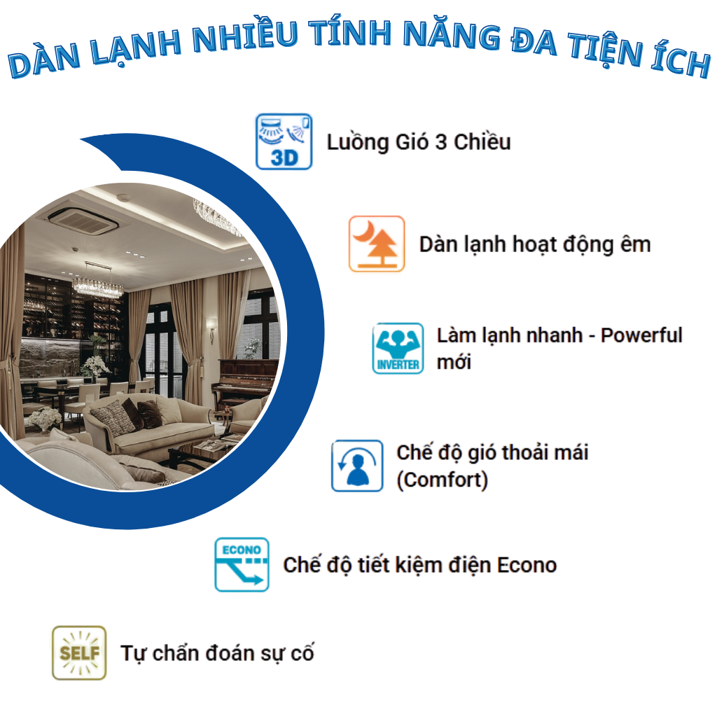 • Đa dạng kiểu dàn lạnh (cassette âm trần, nối ống gió, áp trần, treo tường) giúp đồng bộ và giữ được tính thẩm mỹ cho toàn bộ công trình.